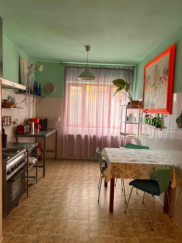 Bucătărie comună, prăjitor de pâine, plită de gătit, ustensile de bucătărie (veselă și tacâmuri), frigider